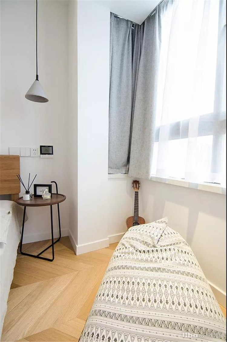 全白的卧室感觉很冷清,床头背景墙的两幅装饰画更显生机。飘窗选用双层窗帘,增加室内采光,也让卧室显得不那么拥挤。