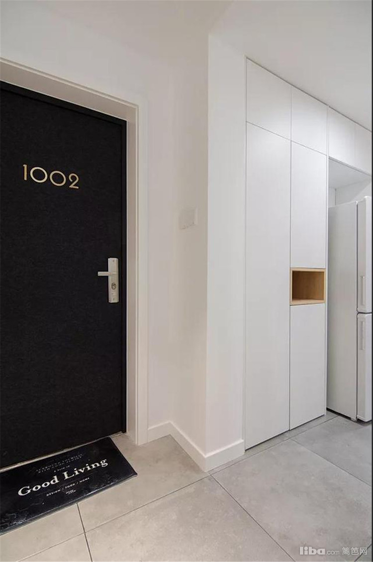 原户型没有玄关,厨房比较大,因为朋友不喜欢下厨做饭,没有用,所以设计师把厨房分一块作为玄关。玄关设计了通顶的白色橱柜,储物就不用担心,哑光材质的看起来简洁大气。