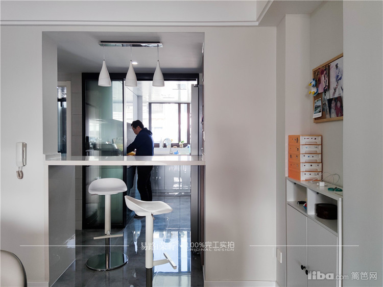 腾出一个双门冰箱的宽度和厚度,把冰箱从不大的厨房解放了出来,黑边铝框联动移门有效解决油烟散透与沾染
