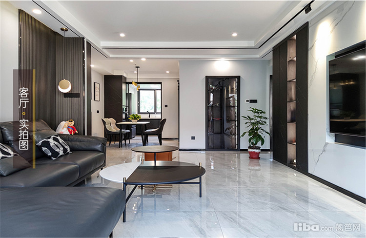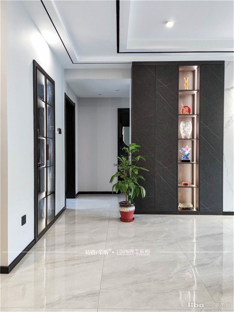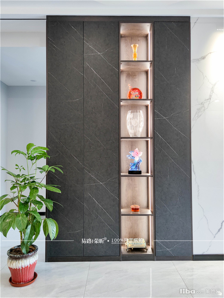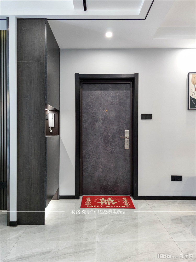 开门见厅户型,无独立玄关,设计师以栏栅板做隔断,置入玄关柜