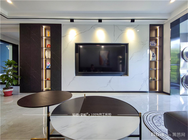 岩板,磁吸灯和槽型板的线形呼应,简洁而充满现代感,金属灯具点缀,提升了家的整体格调。