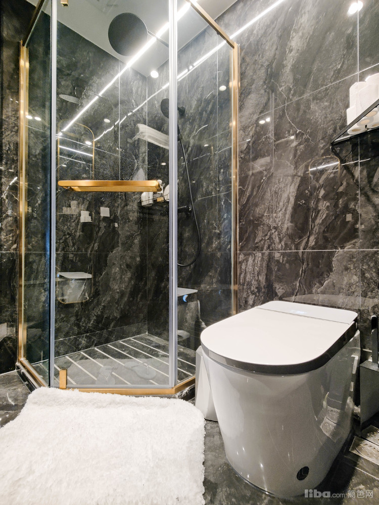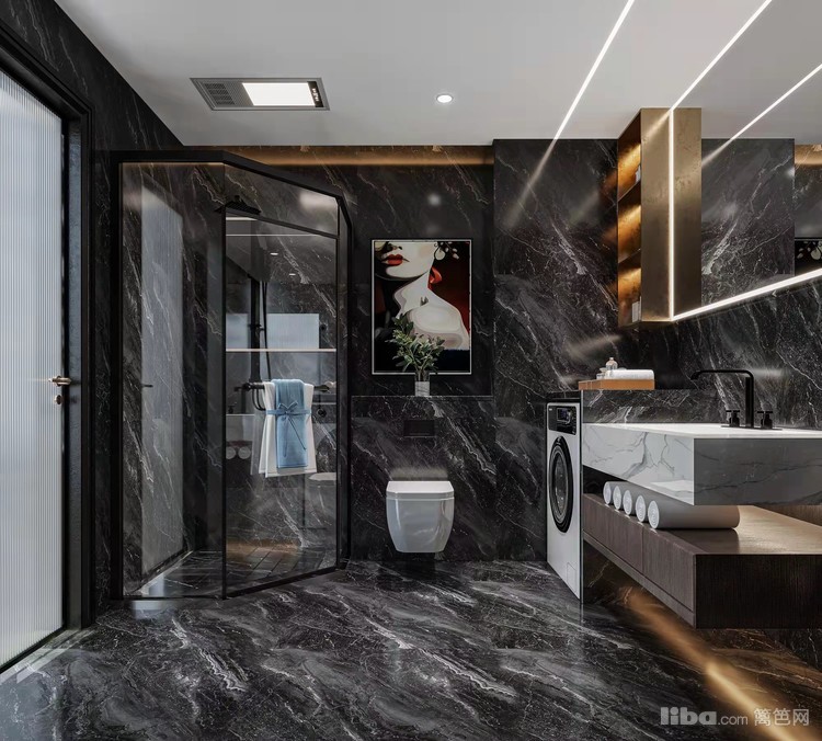 高级暗色系卫生间,很有质感的设计。这个卫生间一点都不会让人感到黯哑,设计师运用最简单的细节,灯光的设计,更大程度上中和暗色调带来的压抑感,给卫生间带来时尚感。