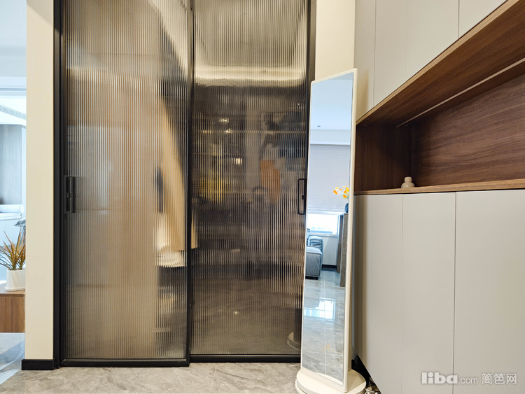 原始户型没有玄关,设计师在进门的右侧放置到顶的玄关柜,增加收纳空间。小小空间布局简单大方,通透度高。