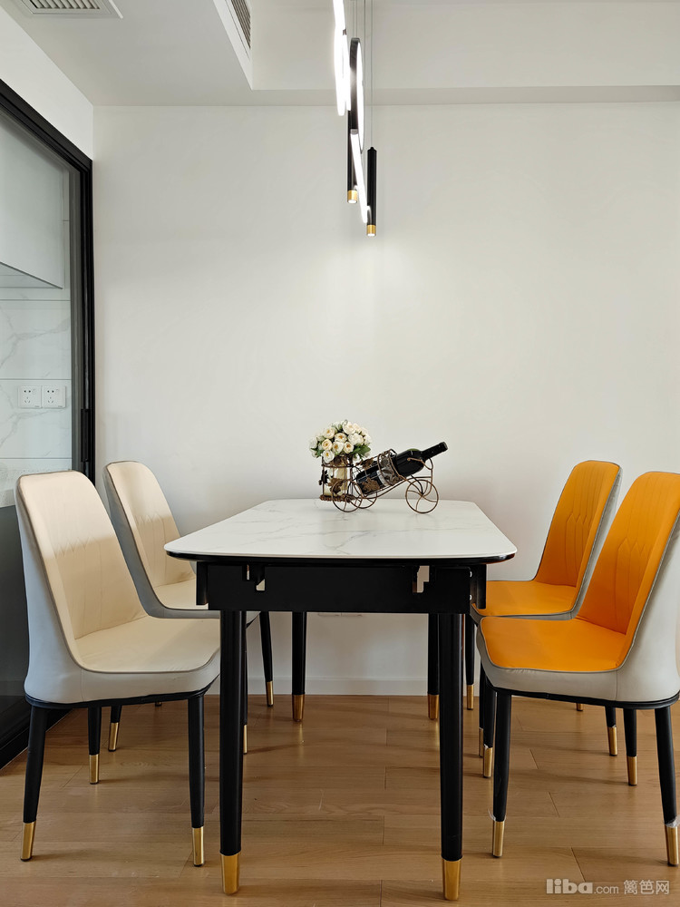 餐厅整体空间简洁,雅白的墙面基础上加入暖木色的空间氛围,令人温馨又舒适轻松;时尚简约的餐桌灯丰富视觉层次感,小摆件增加餐厅空间的氛围感。