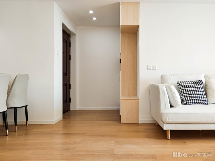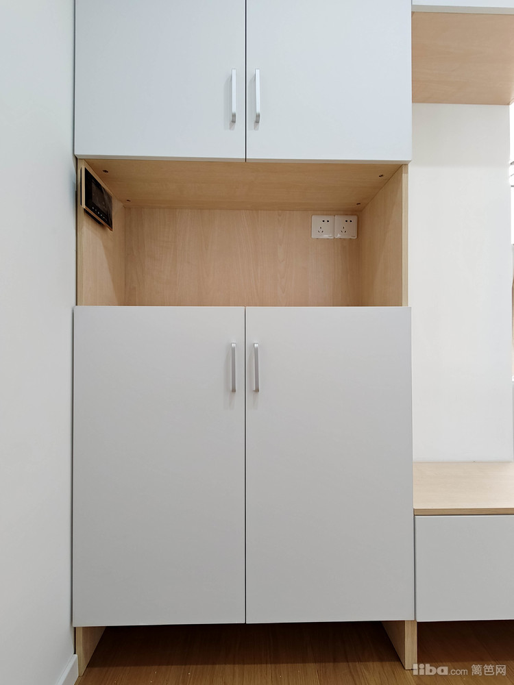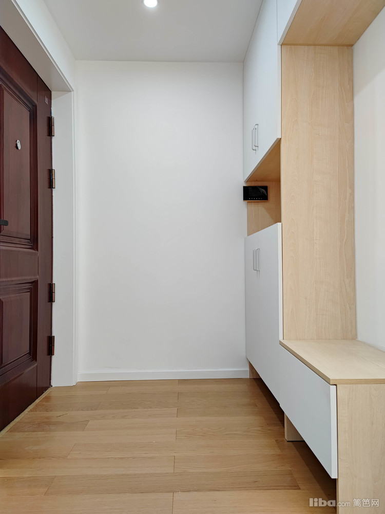 白色高柜中,留下了原木色的空位,侧边嵌入了换鞋凳的设计,上面后期会添加挂钩,增加了空间利用度。