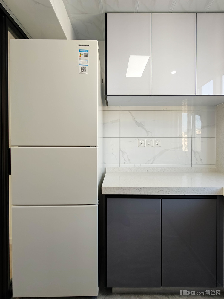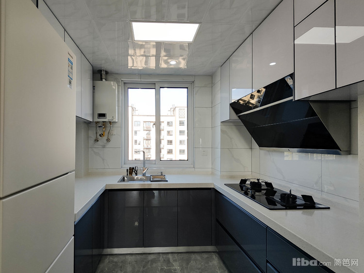 现代简约风最常用的黑白灰三色,在这小小的空间展现的淋漓尽致,黑色的橱柜,净白的吊柜,加上灰色的地面,简洁、大方、明亮,给人干净清爽的感觉。