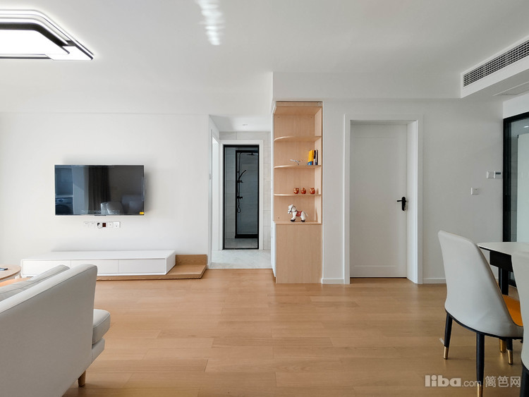 空间色彩以白色为底蕴,包容着浅色木纹纹理,为客厅白色基调的空间添一分温柔感受,自然的中性色调使空间显得格外沉静,纯净的空间让人远离尘嚣追随本心,凸显静谧与惬意。