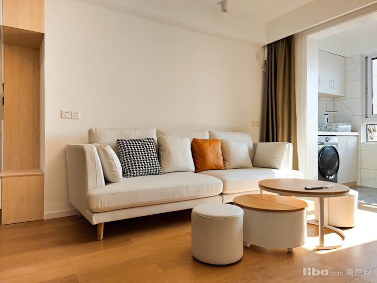 阳台虽然纳入了客厅,但不妨碍空间上的利用,设计了储物柜,同步嵌入洗衣机,放置台上盆洗手台,一个简单的洗衣区就搞定了,简简单单,大大方方,美观实用两不误。