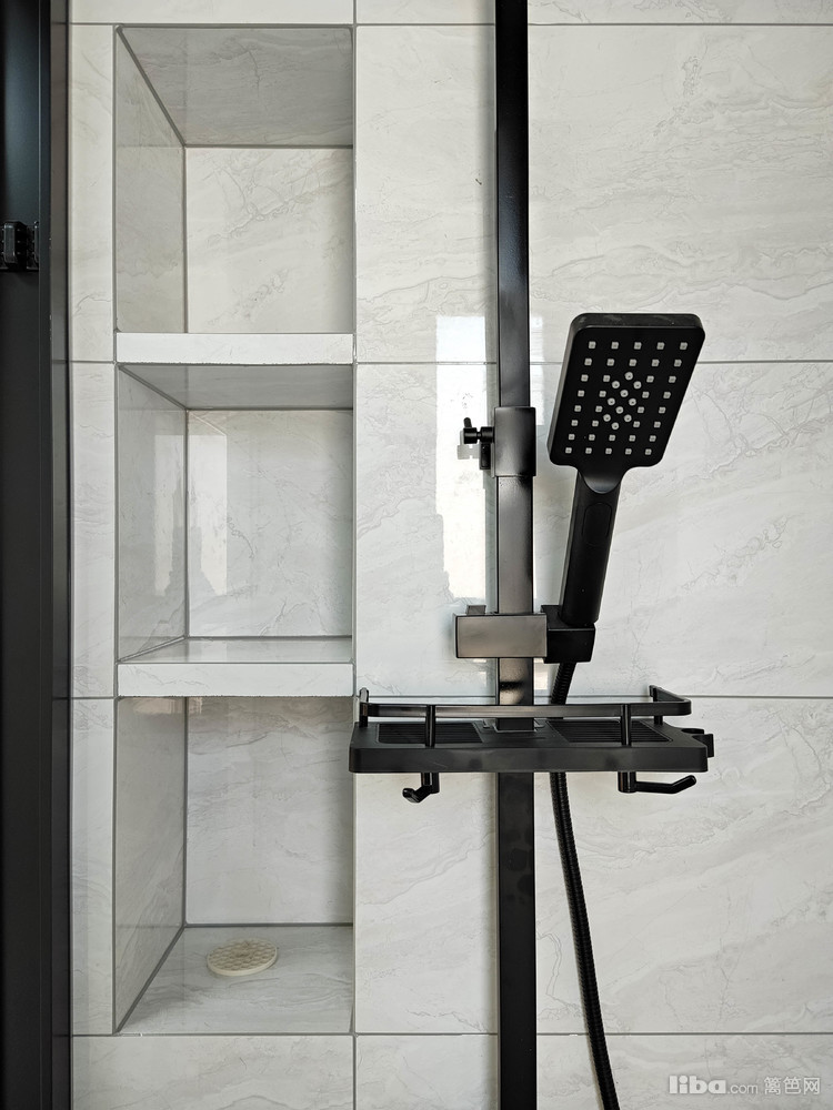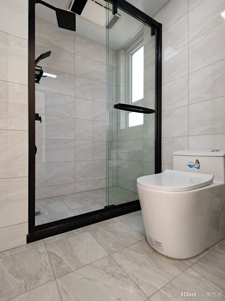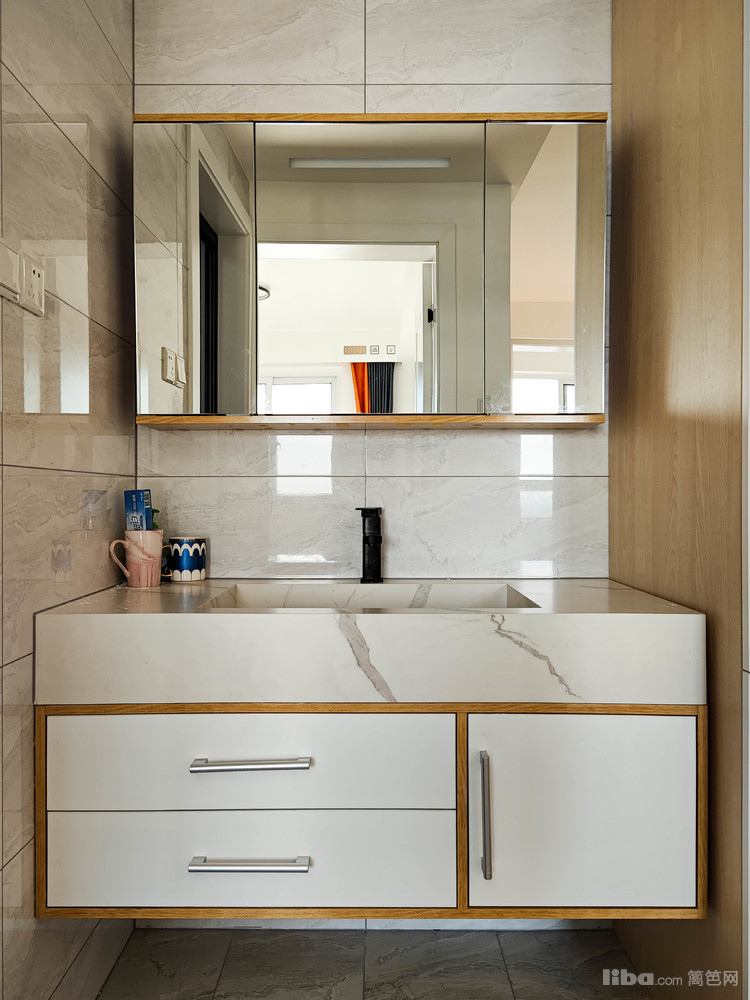 浅灰色的墙地砖搭配白色的浴室柜,黑色与原木色线条相互交汇,清爽通透。
