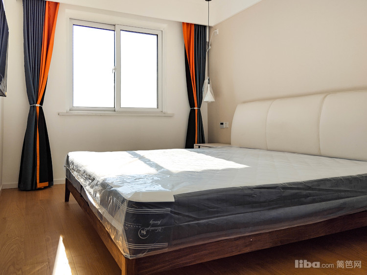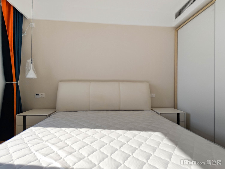 主卧整个空间素雅清淡,设计突出舒适实用,木质的地板和床架、奶咖色的床头背景墙、双色的窗帘,给冰冷的白墙增添了一些暖意,营造出一个优雅舒心的卧室。