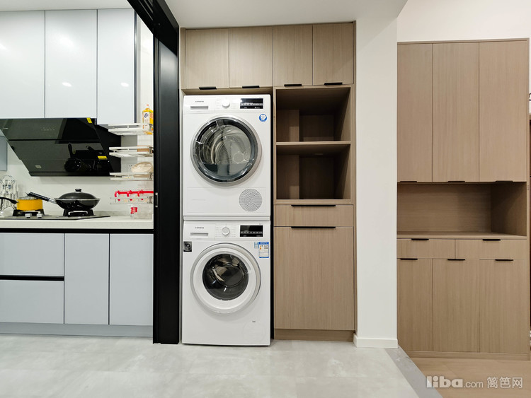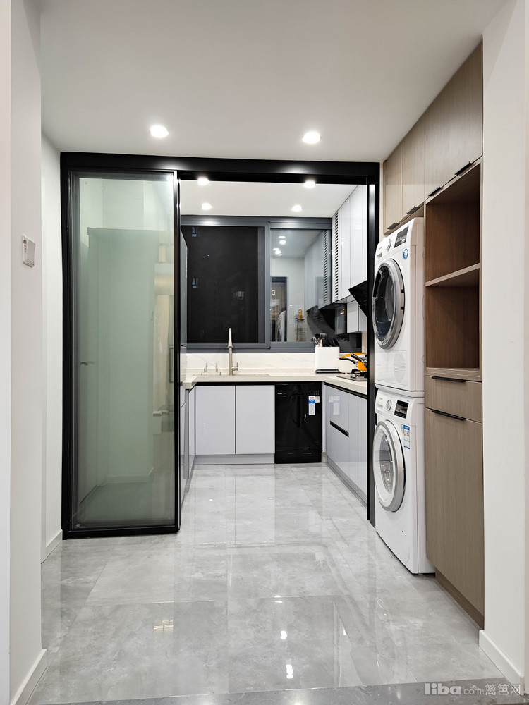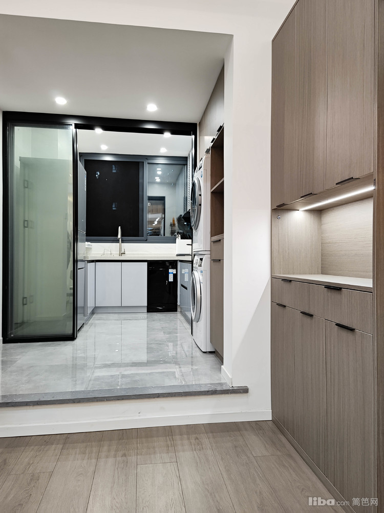 厨房主要以白色为主,整体简约又舒适,在设计上拓宽了进入厨房的门洞,使收纳空间更加丰富,设计师将洗衣家务区置于厨房与玄关之间的过道,提高空间利用率,实用性也翻倍了。