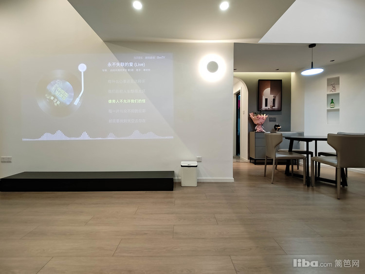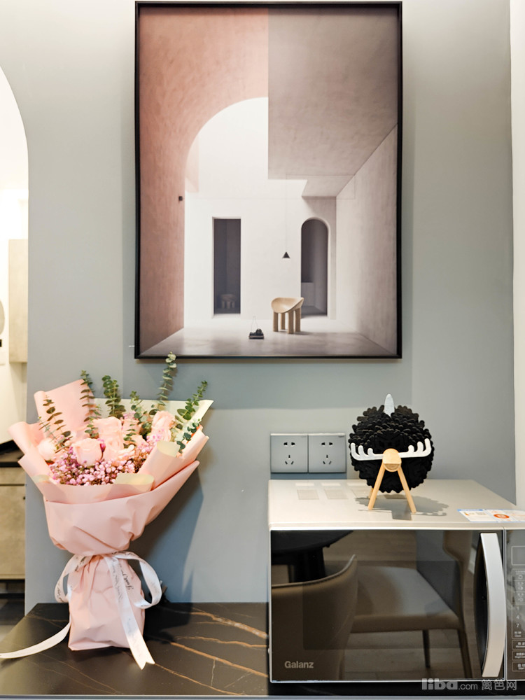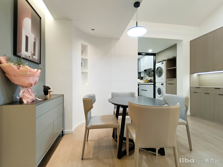 这家一进门是直面卫生间的户型,受空间的局限性,设计师只能通过细节优化,让这个空间显得不生硬,用柔和的曲线元素,做了一个缓冲的设计。