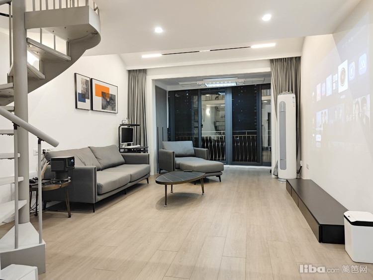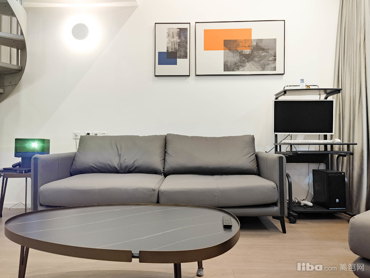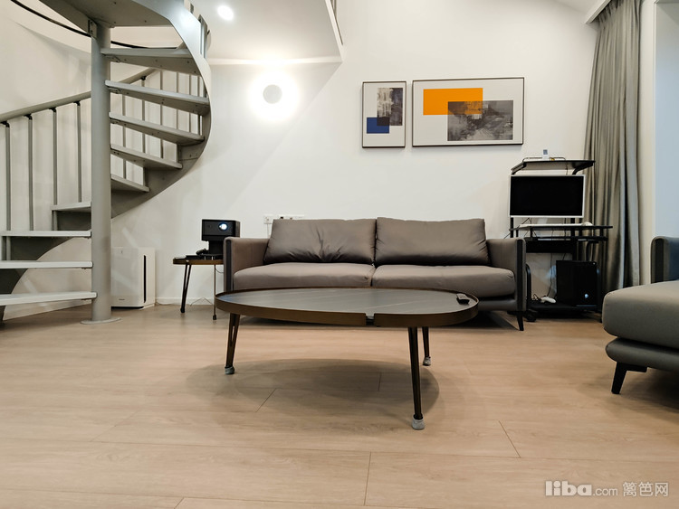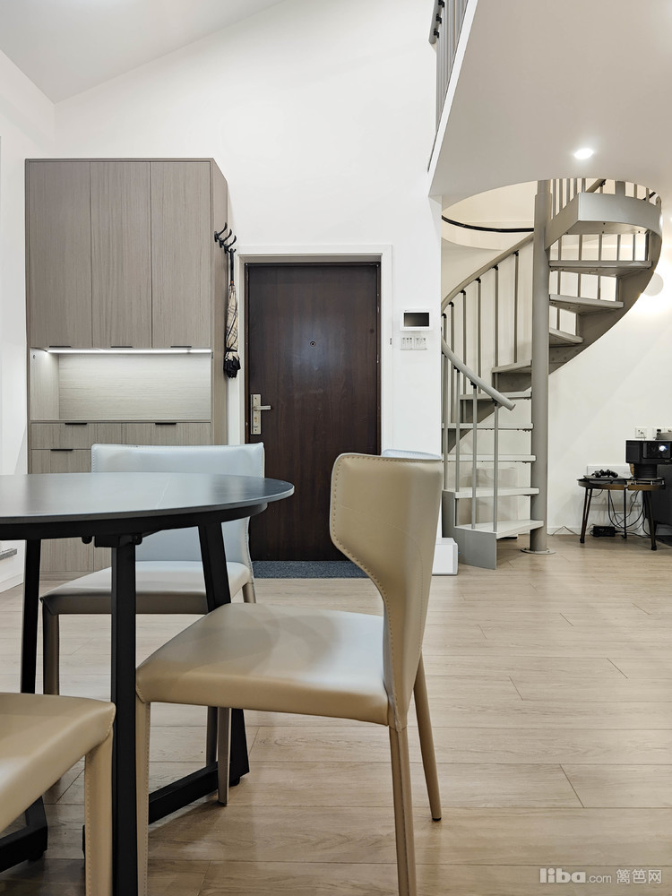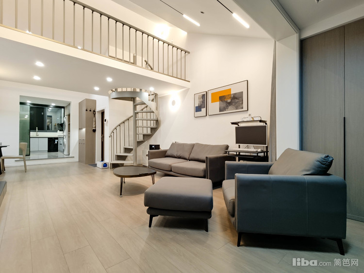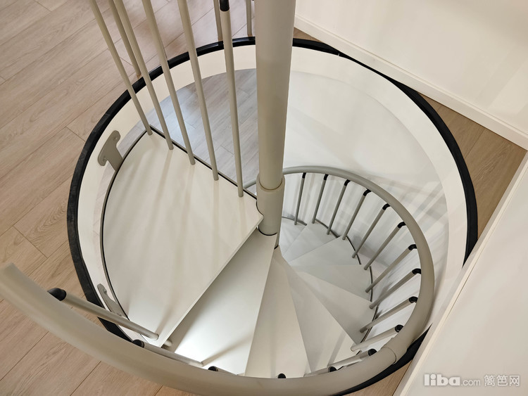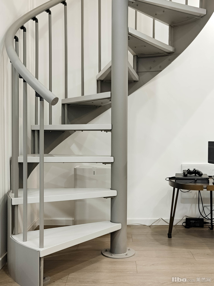 用圆弧形旋转楼梯不仅不占空间,路径也是最小的,沙发和楼梯正好在一个面上,沙发85-90公分,楼梯直径1.4米,没有什么影响,同时弱化了锐利的墙角,也成为了简约空间中最抢眼的点缀。