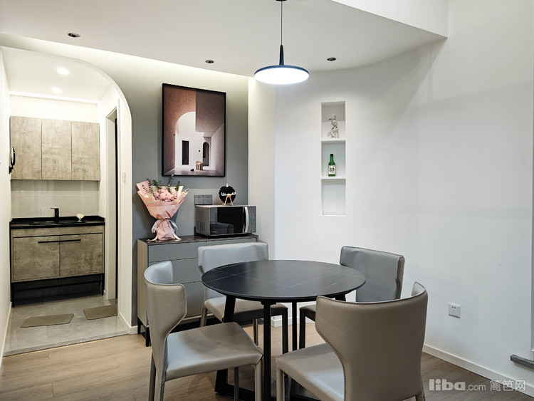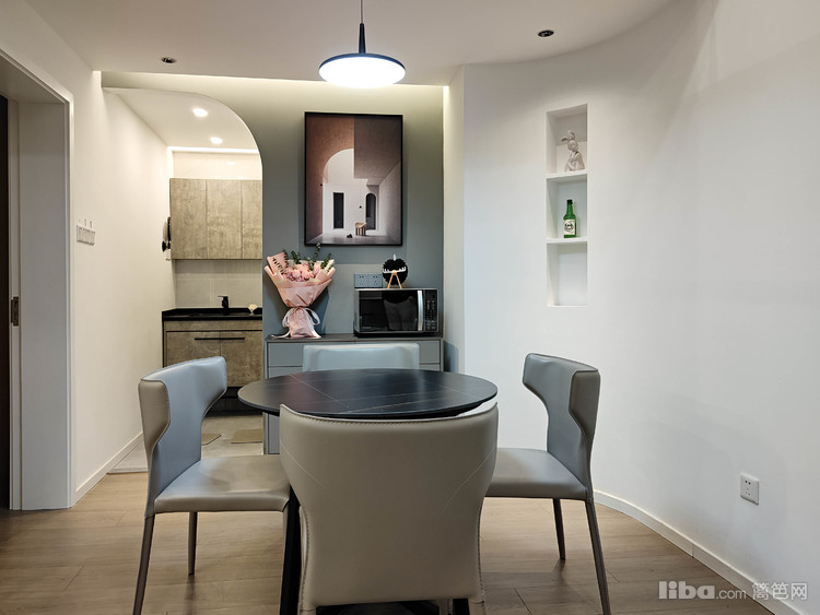 为了空间的最大化利用,餐厅设计弧形的造型,不仅柔化了建筑自带的冷峻又与半拱门造型有了很好的呼应