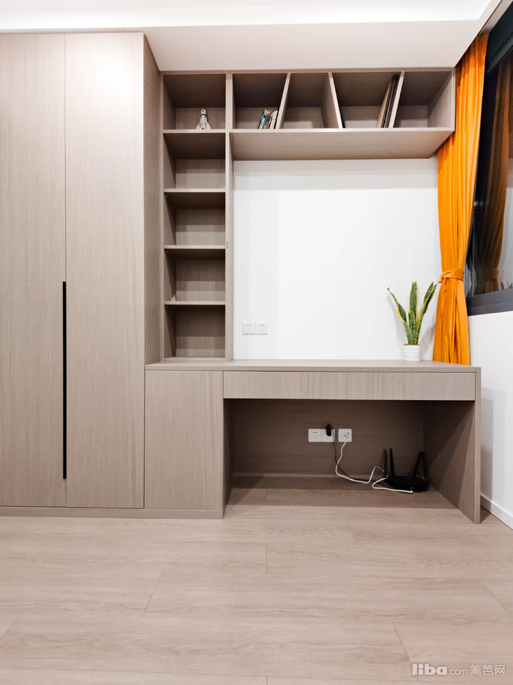 次卧延续了原木+白的配色方案,衣柜搭配书桌的设计,这样不仅能收纳衣物还能办公与学习两不误。L型空格架可以放平时需要书籍、饰品和生活必需品,简单实用又提供了更灵活的空间变化。