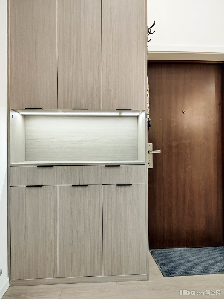 玄关处的设计也是比较简单的,在进门右侧墙面定制与地板同色的原木玄关柜,