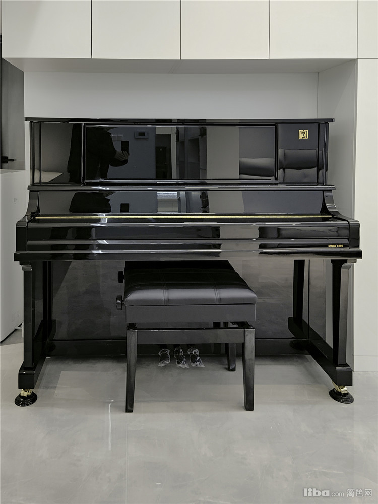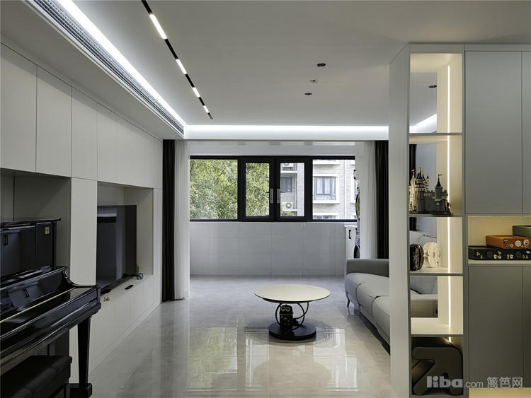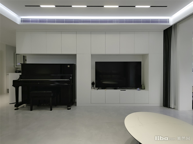 利用钢琴的宽度尺寸与电视柜相组合的方式,在尽可能提高储物空间的前提下,让两者有了更好的协调。