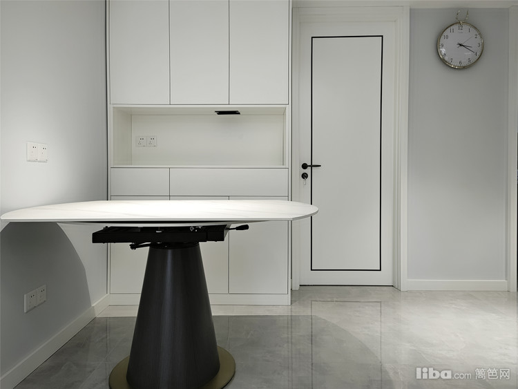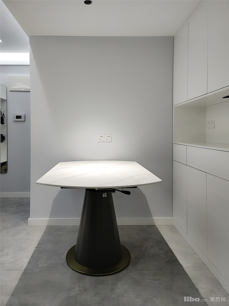 整屋墙面采用了浅灰蓝做底,搭配素雅的灰白色基调,不会过于浓郁,像初雪覆盖冬天;可变折叠餐桌的设计,让方桌变圆桌,可大可小适合不同户型。