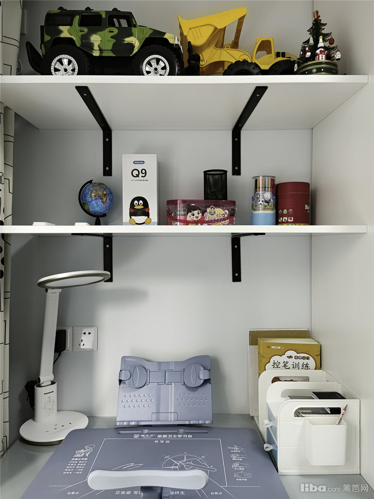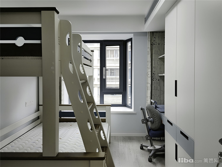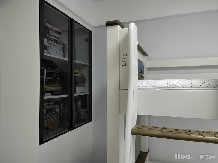 次卧布置了高低床,在满足实际需求的前提下,通长的衣柜加书柜的组合让次卧的功能更加完善