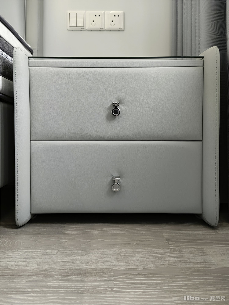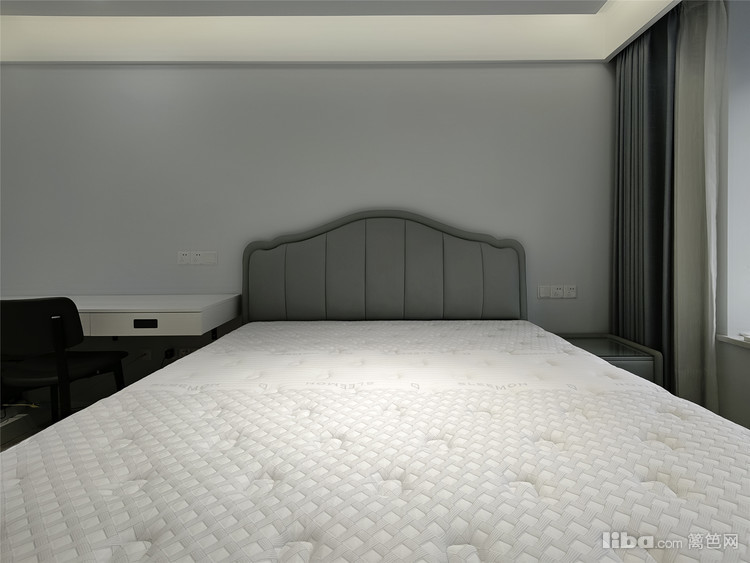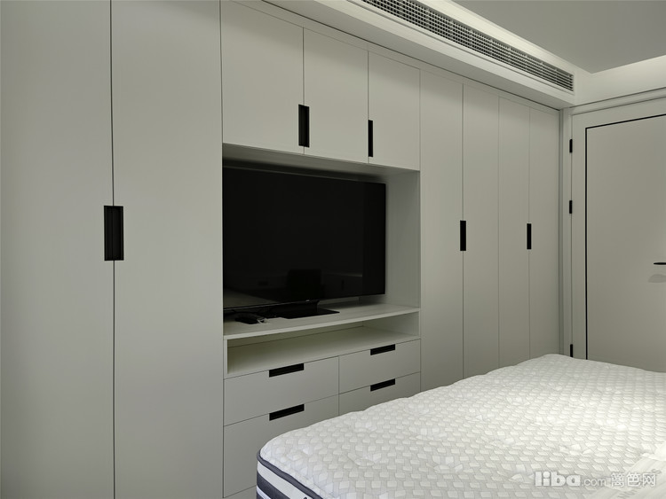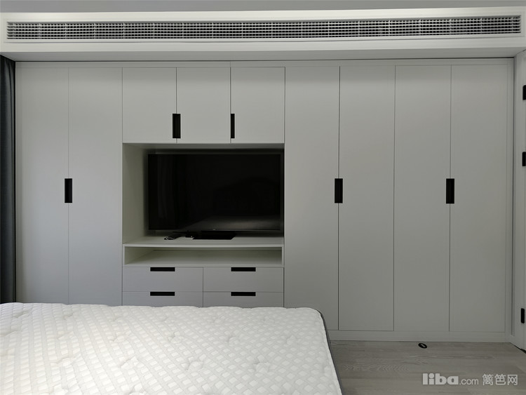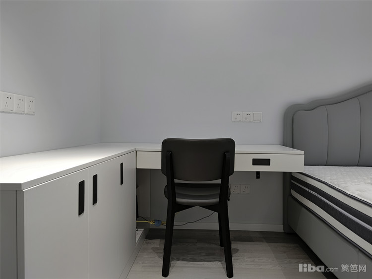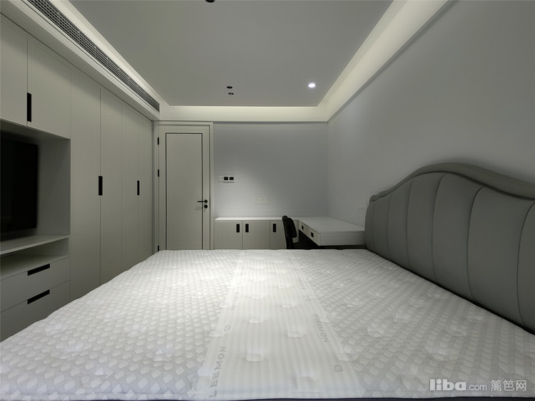 在床对面利用通长的优势做了整排储物柜,极大的保证了衣物的储藏量。床的旁边则布置了一个L型书桌储物一体柜,丰富了不同尺寸物品的储物空间及满足男主人办公功能、女主人梳妆功能。