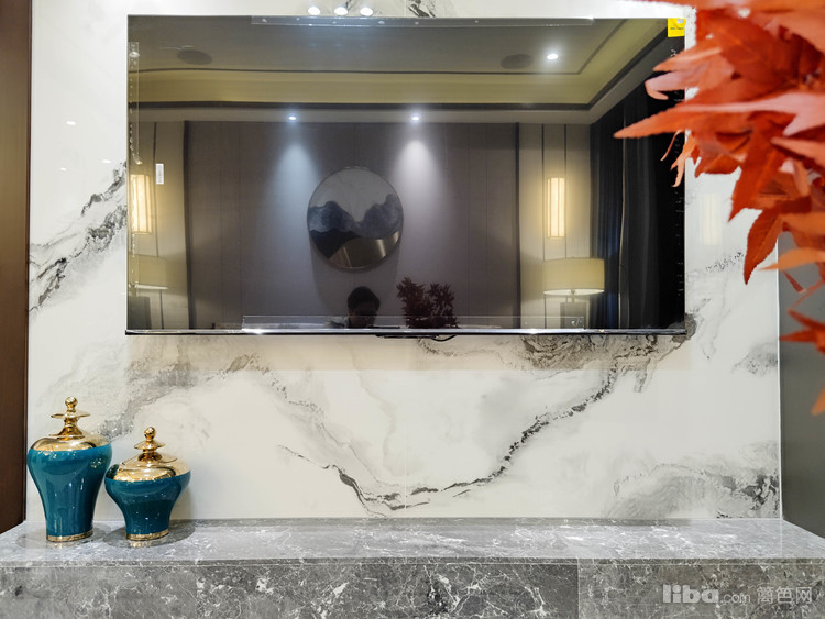 整块的大理石电视背景墙搭配浅色水磨石地台,简单有质感。