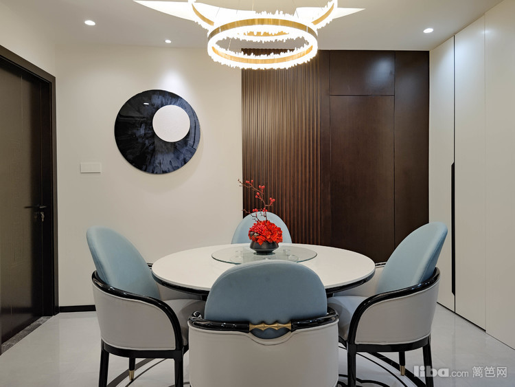 圆形的装饰、环形的吊灯、顶面与圆桌、地砖相呼应,摆上精致的餐具,述说着中式风情。
