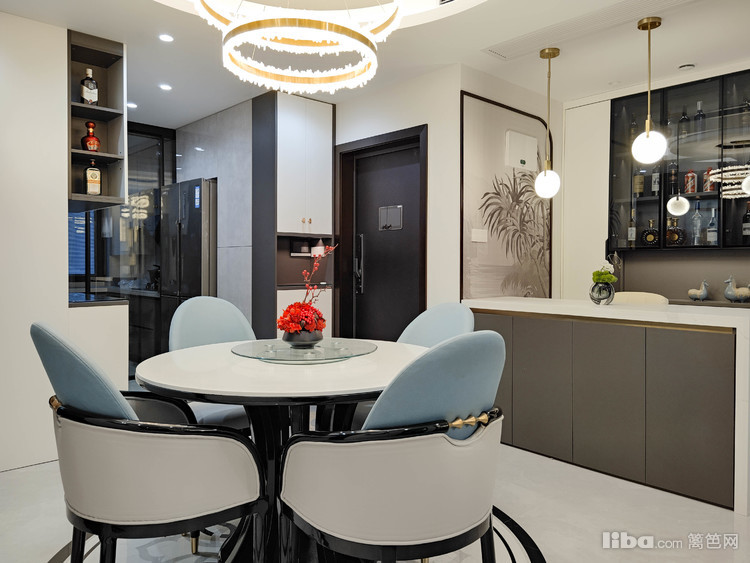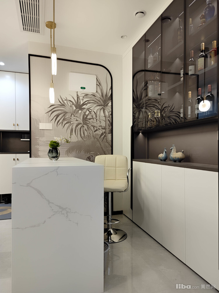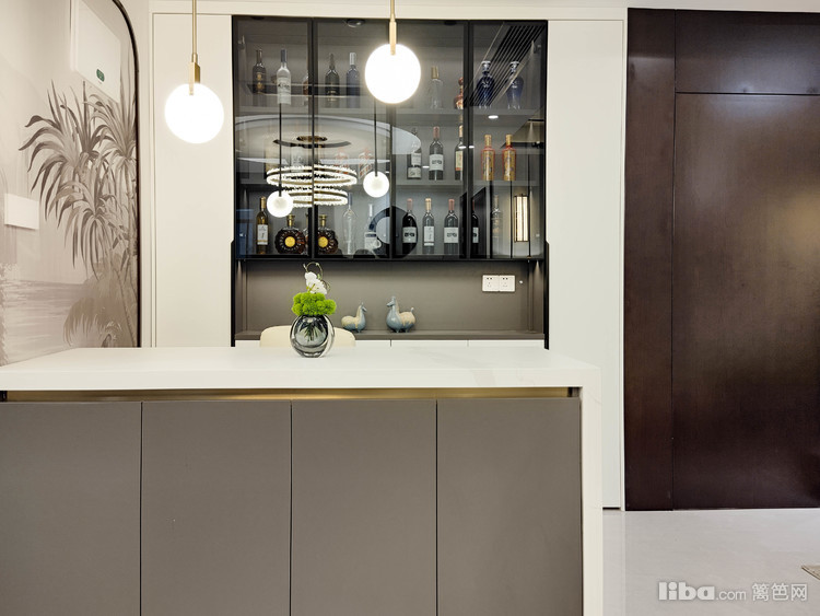吧台正对餐厅,背景墙内嵌半开放式酒柜设计,简约但线条感强,搭配水墨装饰画将现代和古典气质交织融为一体