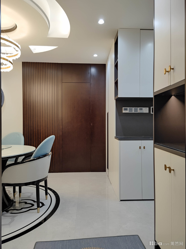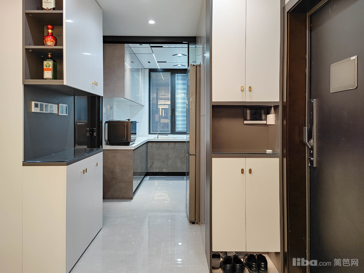 通过重新布局,玄关与餐厨之间的动线距离缩短,在入户门左侧打造一字型玄关柜+冰箱柜,