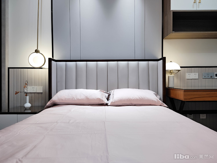 采用暖色调简约的风格,温馨舒适,银灰色背景墙与格栅板结合,时尚设计感十足!