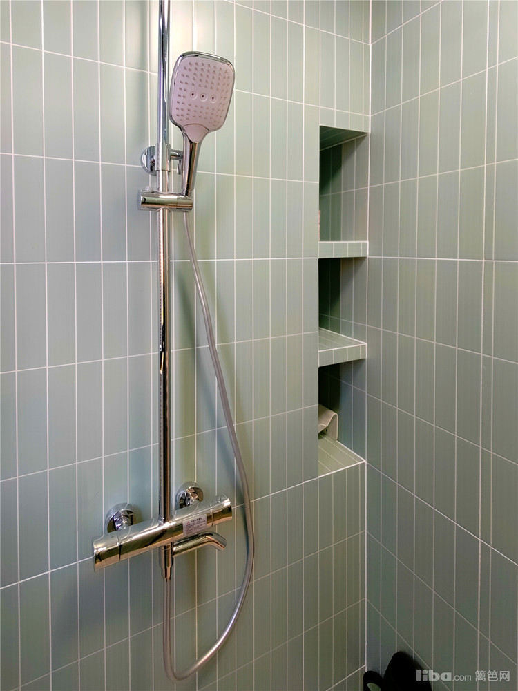 淋浴区墙面则搭配清新绿的艺术砖,清爽又有质感。