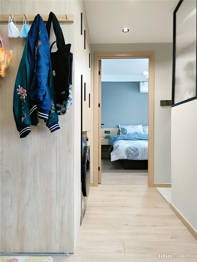 经过改造后又多了一个新的收纳空间,在走廊左边设计一整面储物柜,洗衣机也有放置的地方,非常实用~充分考虑到生活所需的收纳空间。