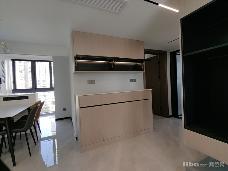 巧用过道做了分体式餐边柜,中间留空台面,预留插座可放饮水机或咖啡机;