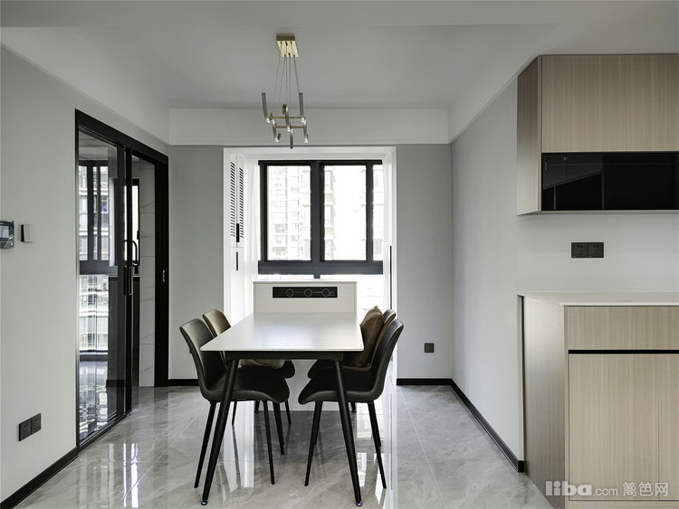 餐厅采用定制岛台+成品餐桌的组合,这样空间的利用更加灵活,后期想要更换餐桌也比较容易。 带阳台的餐厅不仅让光线和空间档次整体提升,视觉上也有延伸感,两侧做了充足的柜体储物。