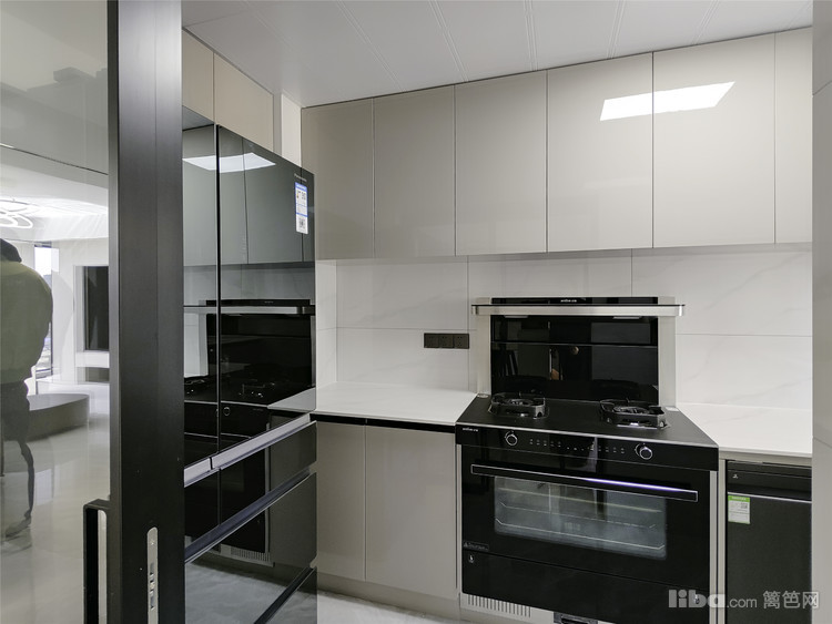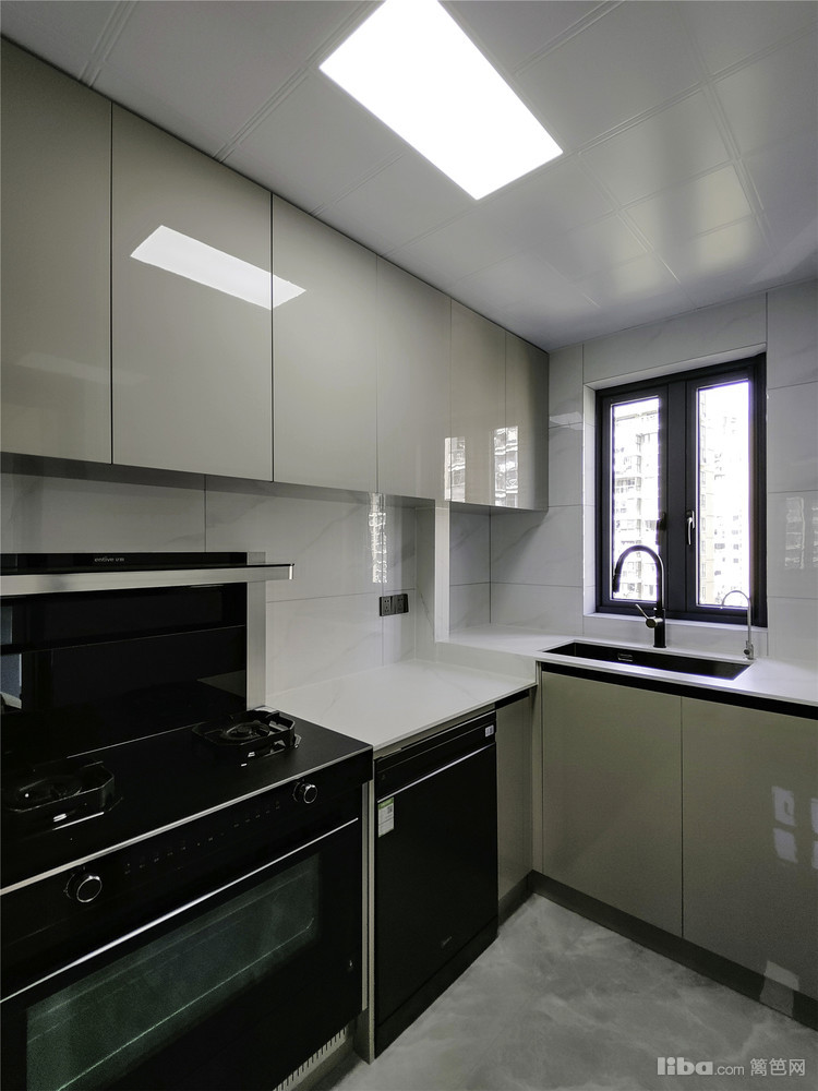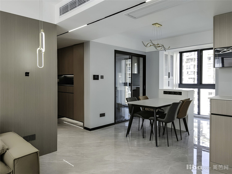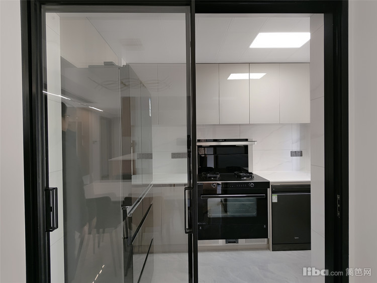 厨房采用双开推拉门吊轨设计,保持地面完整流畅,清扫起来也更加方便;细边黑框推拉门,在开放与封闭之间自由切换,高透光的玻璃材质让厨房得到了最大化的采光。