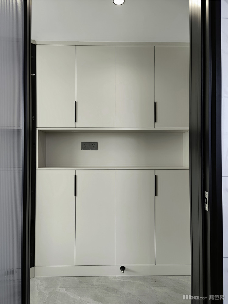 进门一侧打造1.6米的收纳柜,顶天立地的鞋柜中间与下方都做了留空设计,前者方便顺手放置钥匙、手机等物提升入户的舒适感,后者是为了收纳日常换穿鞋,让动线更加便捷。