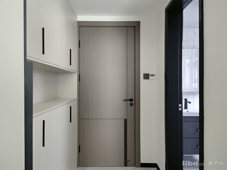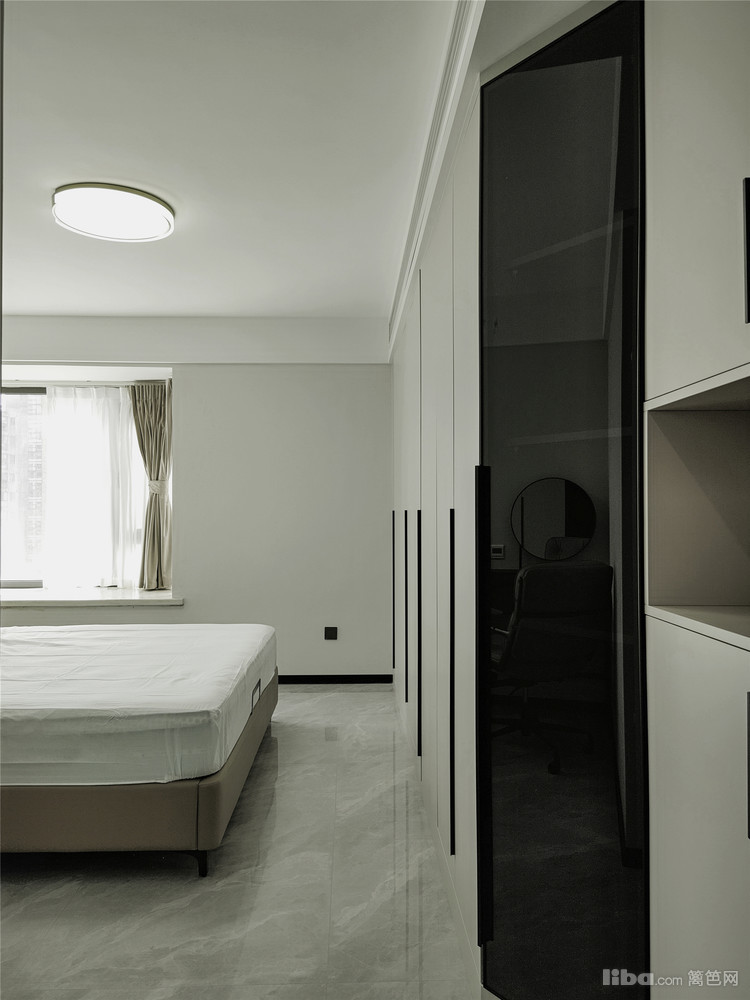 原先卫生间门正对着床,影响物主居住体验,改变卫生间门洞位置后,不仅避免了卫生间直冲卧室,而且还设计了满墙的收纳柜,卧室进门一排柜到底,大大增加了卧室的收纳空间。