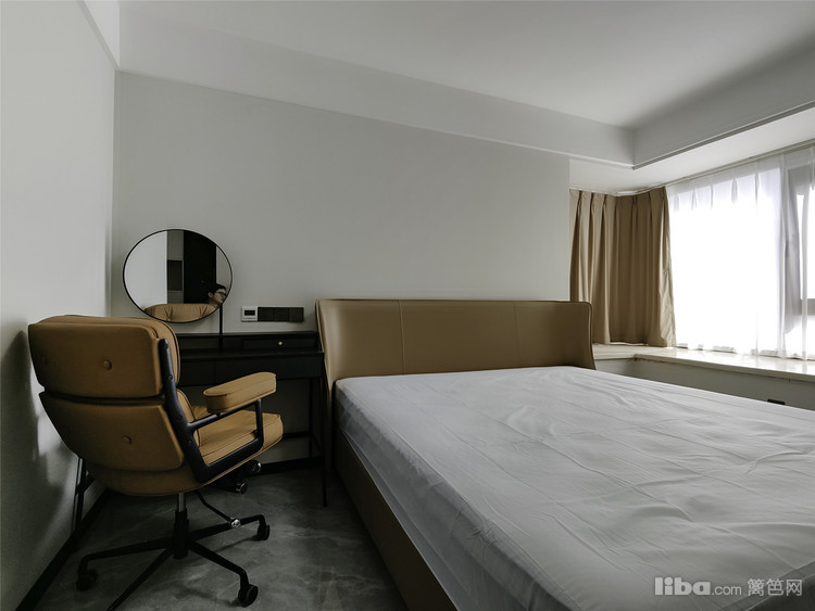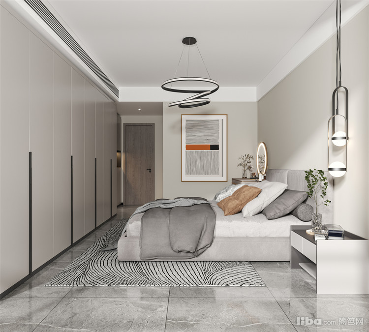 主卧空间主要以灰、白基调营造静谧的氛围,偏暖的卡其色作为空间的点缀,让这个偏冷的空间变得温暖、柔和。