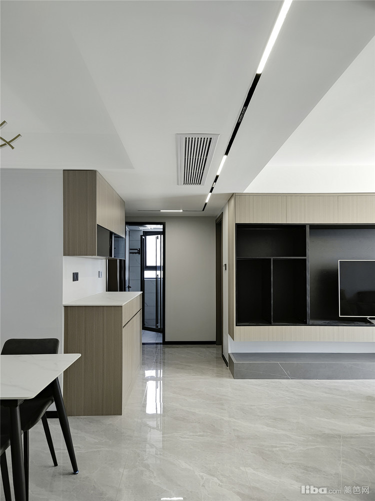 木饰面材质从入户玄关延伸到沙发墙与灰色乳胶漆结合,延伸了视觉空间感,在分割区域的同时又同属一个空间。