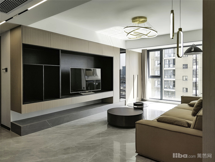 电视柜以黑色+木色撞色的悬浮柜体营造视觉的冲击感,结合下方大理石台阶的留空,增强空间的设计感。