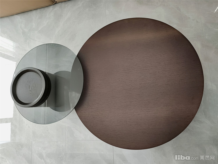 客厅中间布置了一款组合茶几, 圆是非常具有美感的图形,两个圆形茶几的搭配,一轻一重,高低错落,