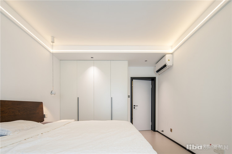 卧室采用无主灯形式,通过单眼皮造型吊顶侧边增加嵌入线条灯。这种设计在解决空间均匀照明的同时,灯光也不会刺眼,为屋主营造了一个宁静舒适的睡眠环境。