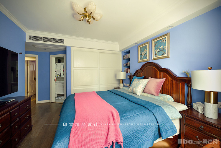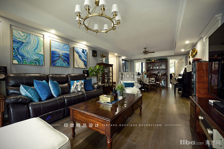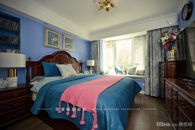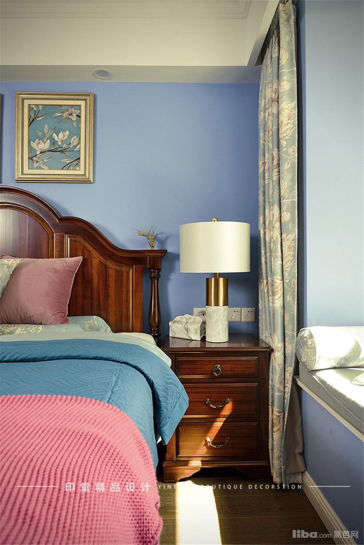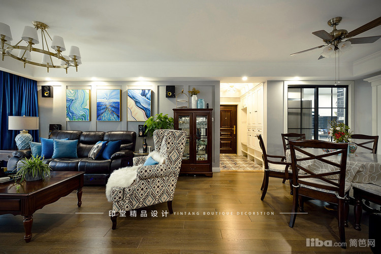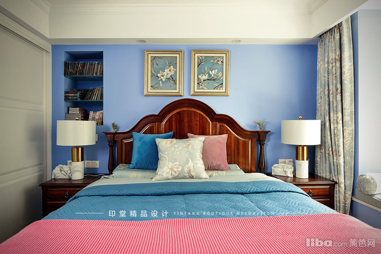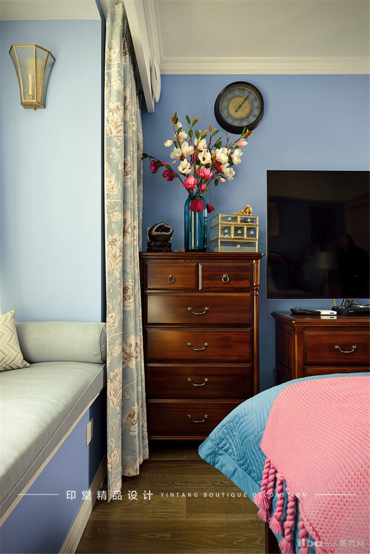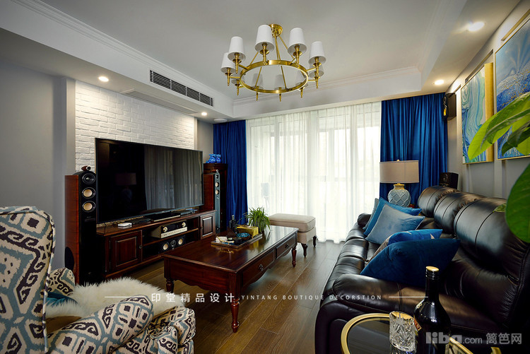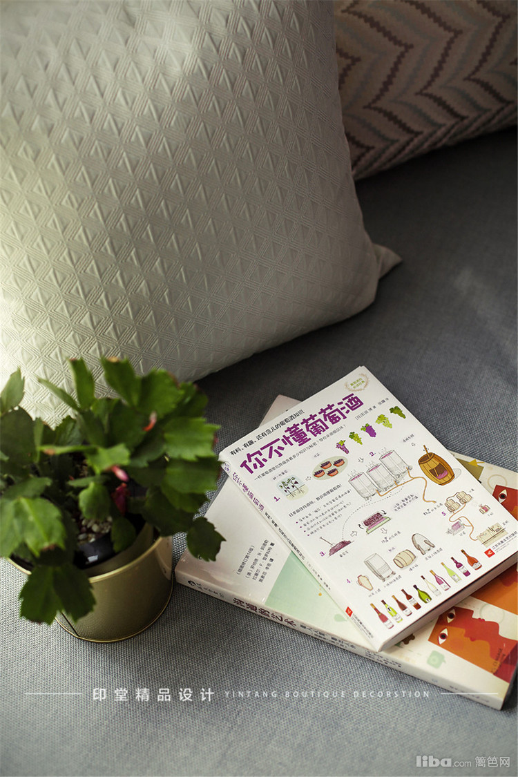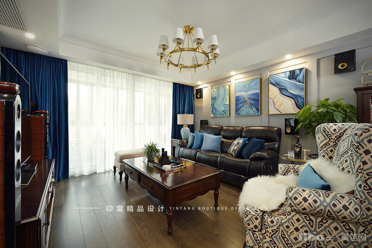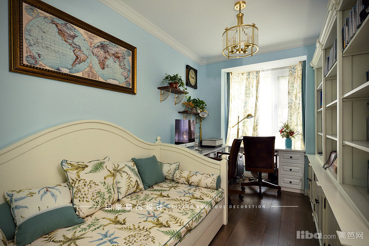 挂画和窗帘抱枕的选择上运用了蓝色,提亮了整个空间的视觉感。