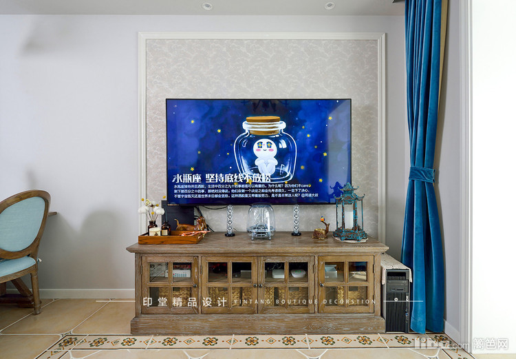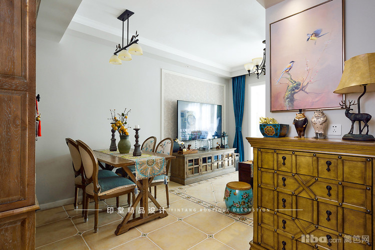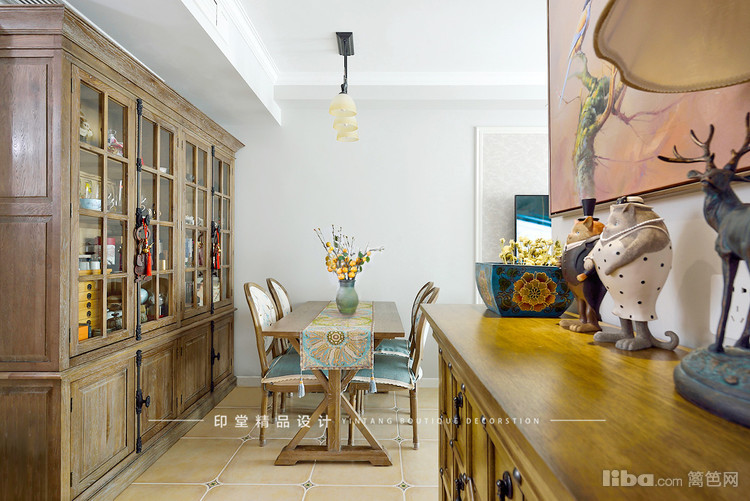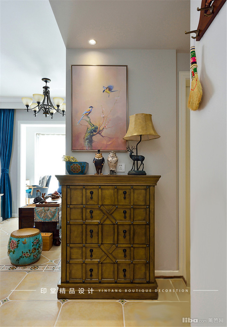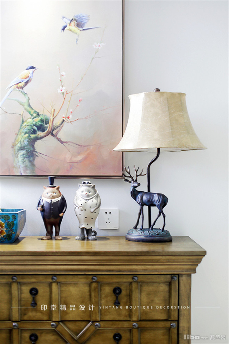 复古风的玄关柜,麋鹿造型的灯具营造出宁静的居家氛围。