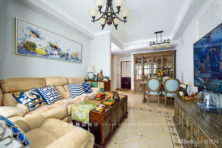 客厅地面斜贴复古砖,搭配米色沙发,整体色调比较的柔和。