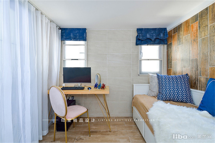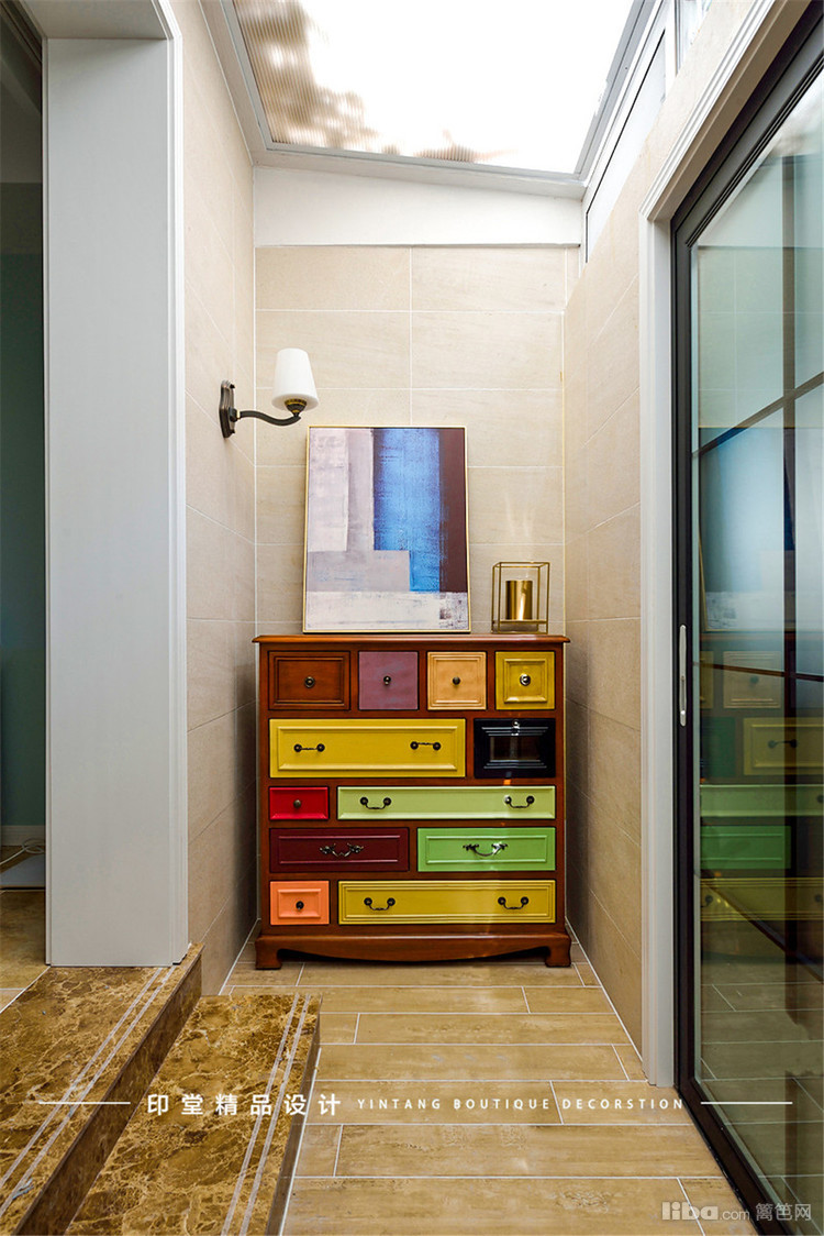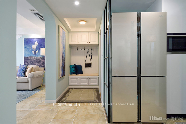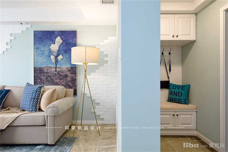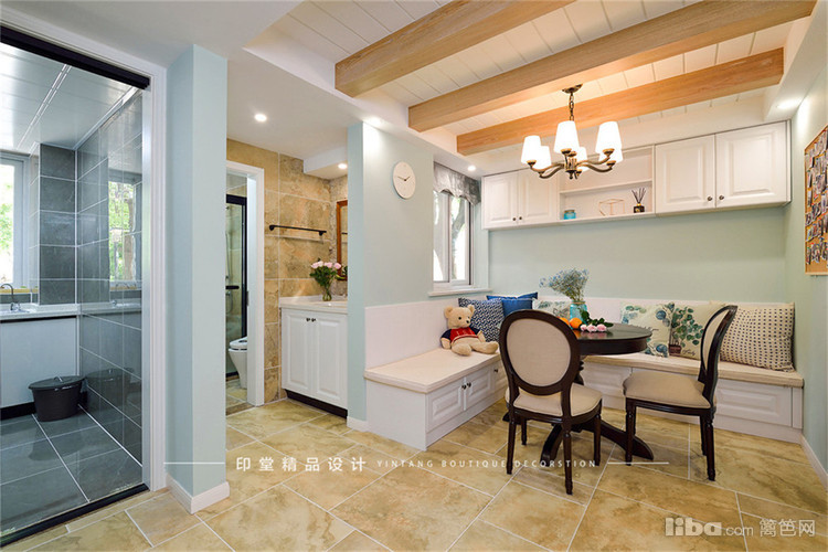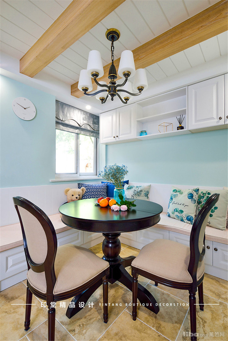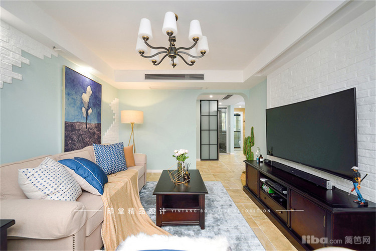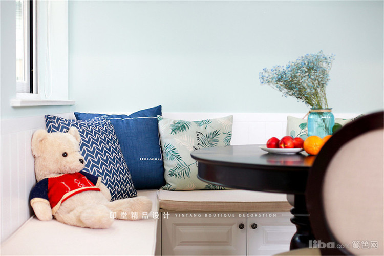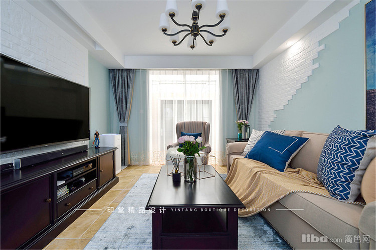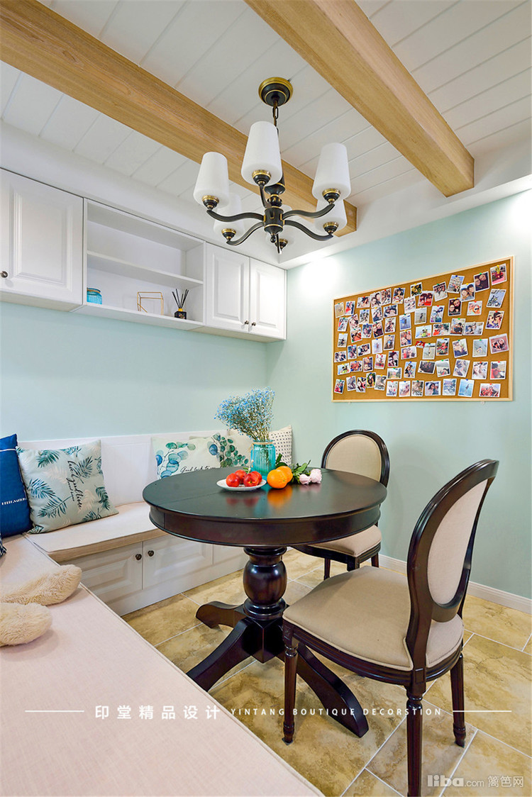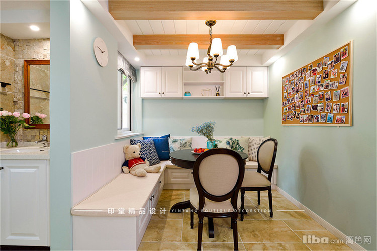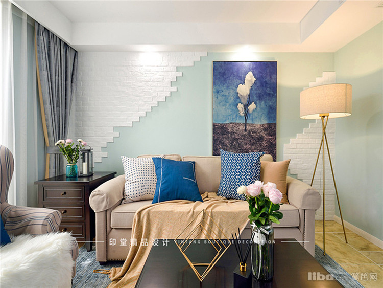 整体风格已清新的美式简约为主,浅薄荷绿的色调,自然舒适。搭配布艺沙发更显温馨。