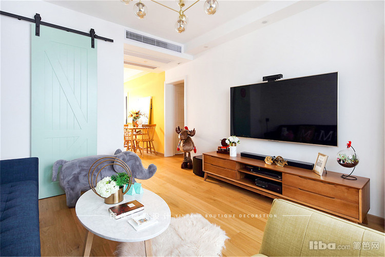 客厅摒弃了复杂的设计,采用最简单的白色作为主色调,搭配典型的北欧式软装,给人视觉上的享受。一侧运用了时下流行的谷仓门作为装饰,使空间更具时尚气息。