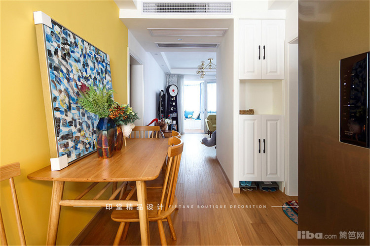 餐厅大胆地采用了明黄色调,黄色除了给人视觉扩张感外还可以启到增加食欲的作用。搭配原木色家具,艺术感较强的装饰画和绿植装饰物,不禁让人想在这里多逗留一会。