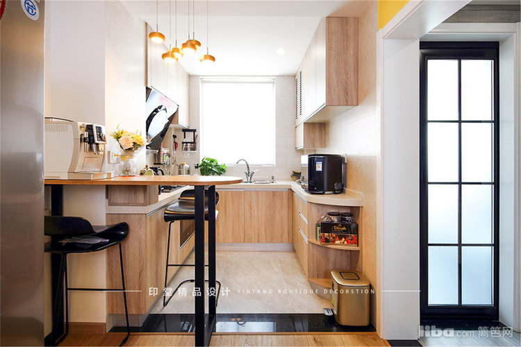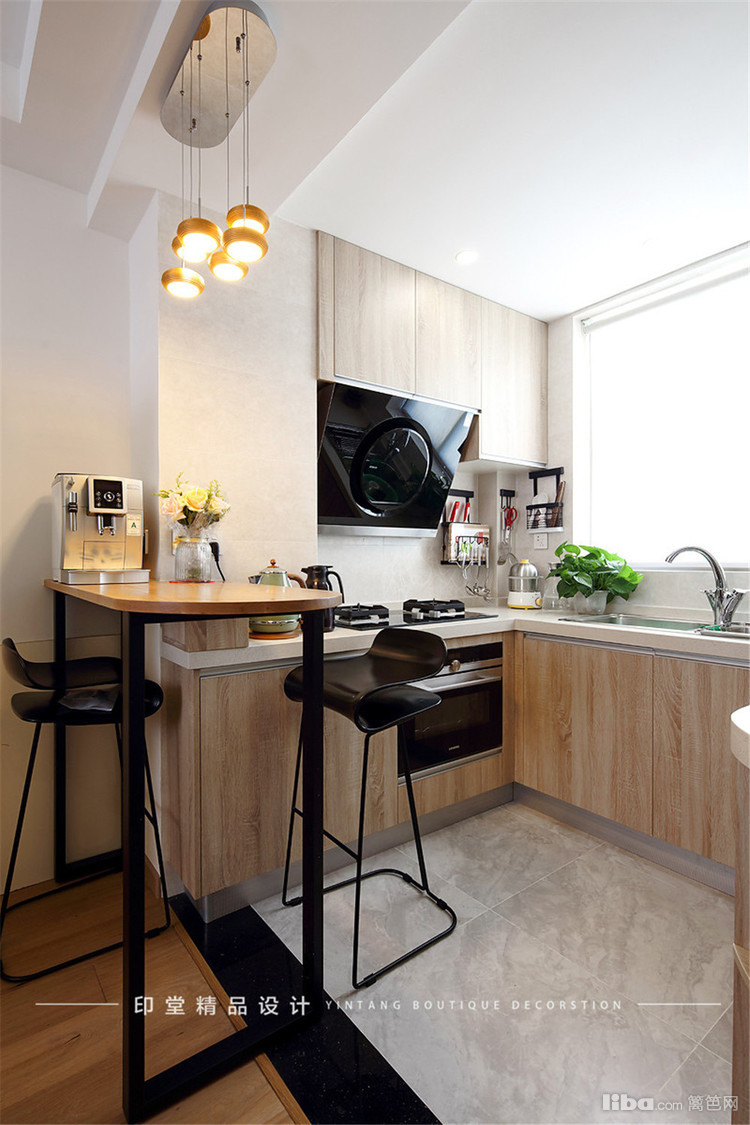 原有房型厨房及餐厅偏小,设计师充分考虑到储物和采光的需求做了开放式厨房的设计,同时贴合年轻业主的喜好,设计了一款精致的吧台。