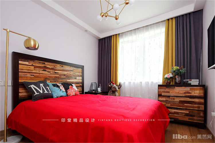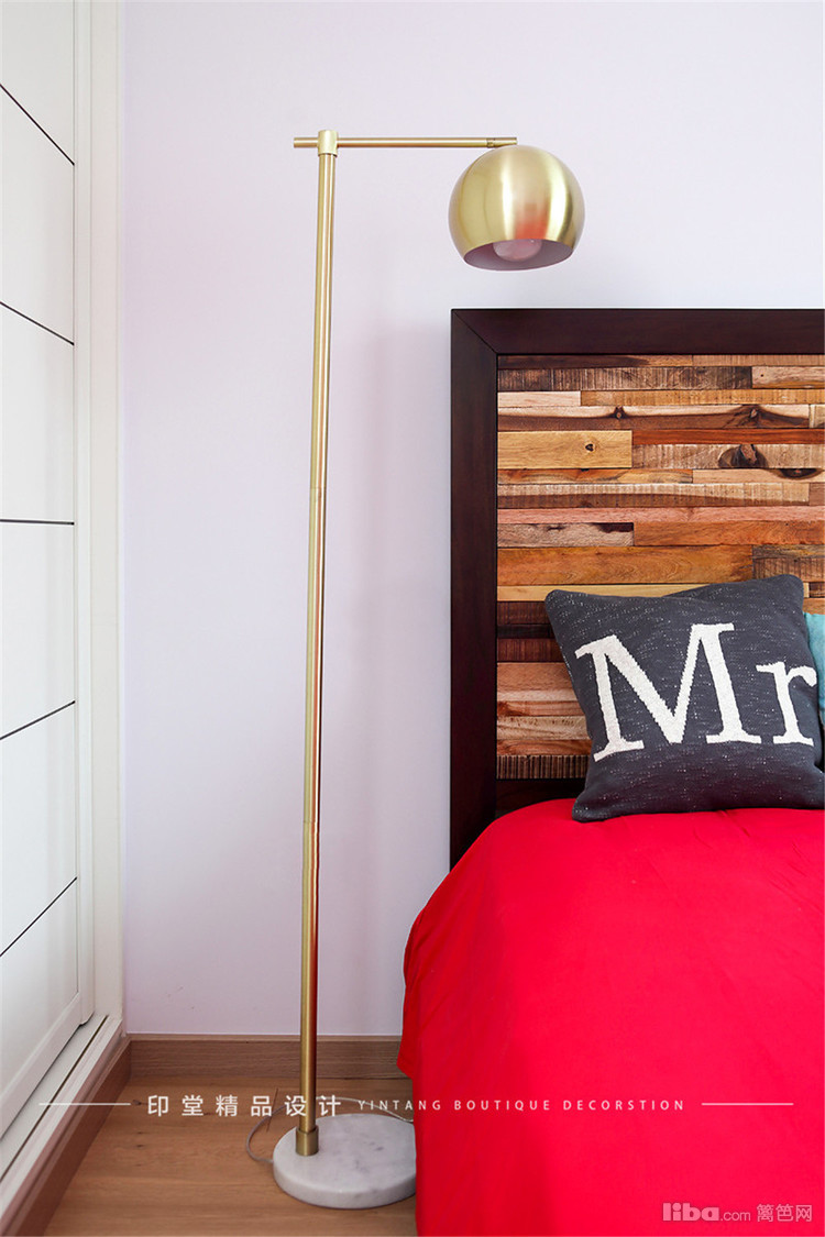 卧室与客厅相呼应,延续了简洁的主题,白色的墙面,金属灯饰作为点缀。在床的选择上彰显了不乏的品味,木质拼贴的款式加入做旧的效果,艺术感十足。