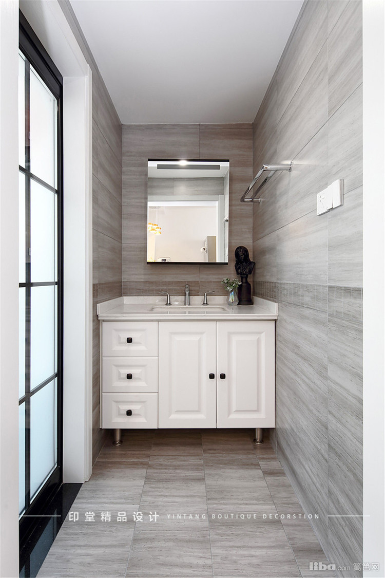 原有北阳台扩大为卫生间区域,卫生间做了干湿分离,采用了统一的灰色砖,现代感十足。白色定制台盆柜和镜柜设计增加了更多储物空间。